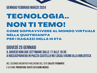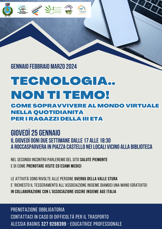 Giovedì 25 gennaio alle 17 nel Comune di Roccasparvera si terrà il secondo appuntamento del percorso di facilitazione digitale rivolto a tutti gli anziani over65 della Valle Stura. La proposta nasce dalla collaborazione tra il Comune di Roccasparvera, lo CSAC, l’Associazione Insieme Diamoci Una Mano, Cooperativa Emmanuele e l’associazione AGE Uscire Insieme. Le date del corso sono le seguenti: 25 gennaio, 1 febbraio, 15 febbraio, 29 febbraio, 14 marzo dalle ore 17 alle ore 18:30 presso gli spazi comunali adiacenti alla biblioteca, in piazza Castello.