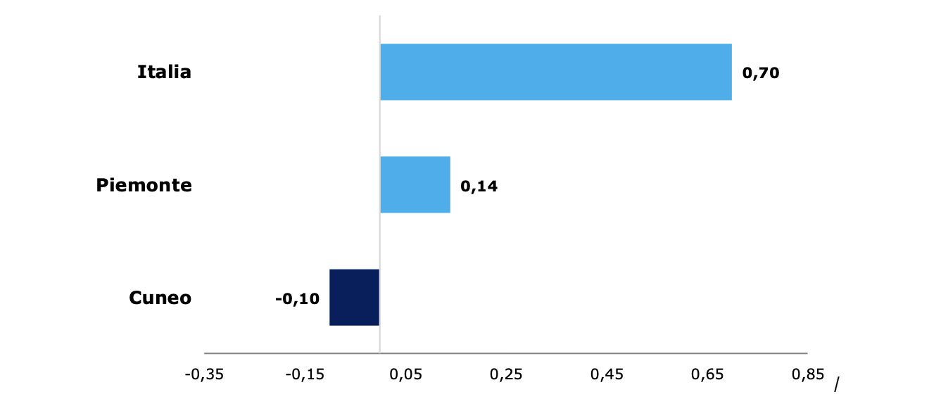 Il tasso di crescita della provincia di Cuneo (-0,10%) risulta in controtendenza rispetto a quello regionale (+0,14%) e nazionale (+0,70%).