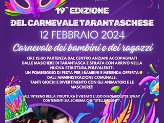 Gli Amici della biblioteca in collaborazione con il Comune di Tarantasca e il Baby Parking “A piccoli passi” organizzano il carnevale tarantaschese, giunto alla sua 19° edizione. La giornata di festa dedicata principalmente ai ragazzi e ai bambini sarà l𝒖𝒏𝒆𝒅ì 𝟏𝟐 𝒇𝒆𝒃𝒃𝒓𝒂𝒊𝒐 𝟐𝟎𝟐𝟒. Ritrovo alle 15,00 presso piazza Fratelli Giordana, dal Centro anziani e sfilata con le maschere di Tarantasca Cavalier Caranta, Madama Tarantasia e la Damigella di corte. Arrivo presso il Salone Polivalente e pomeriggio di giochi, merenda offerta dall'Amministrazione Comunale e tanto divertimento con gli animatori! 𝑺𝒐𝒏𝒐 𝒊𝒏𝒗𝒊𝒕𝒂𝒕𝒊 𝒕𝒖𝒕𝒕𝒊 𝒊 𝒃𝒂𝒎𝒃𝒊𝒏𝒊 𝒆 𝒓𝒂𝒈𝒂𝒛𝒛𝒊 𝒎𝒂𝒔𝒄𝒉𝒆𝒓𝒂𝒕𝒊 𝒑𝒆𝒓 𝒖𝒏𝒂 𝒈𝒊𝒐𝒓𝒏𝒂𝒕𝒂 𝒅𝒊 𝒂𝒍𝒍𝒆𝒈𝒓𝒊𝒂 𝒆 𝒇𝒆𝒔𝒕𝒂