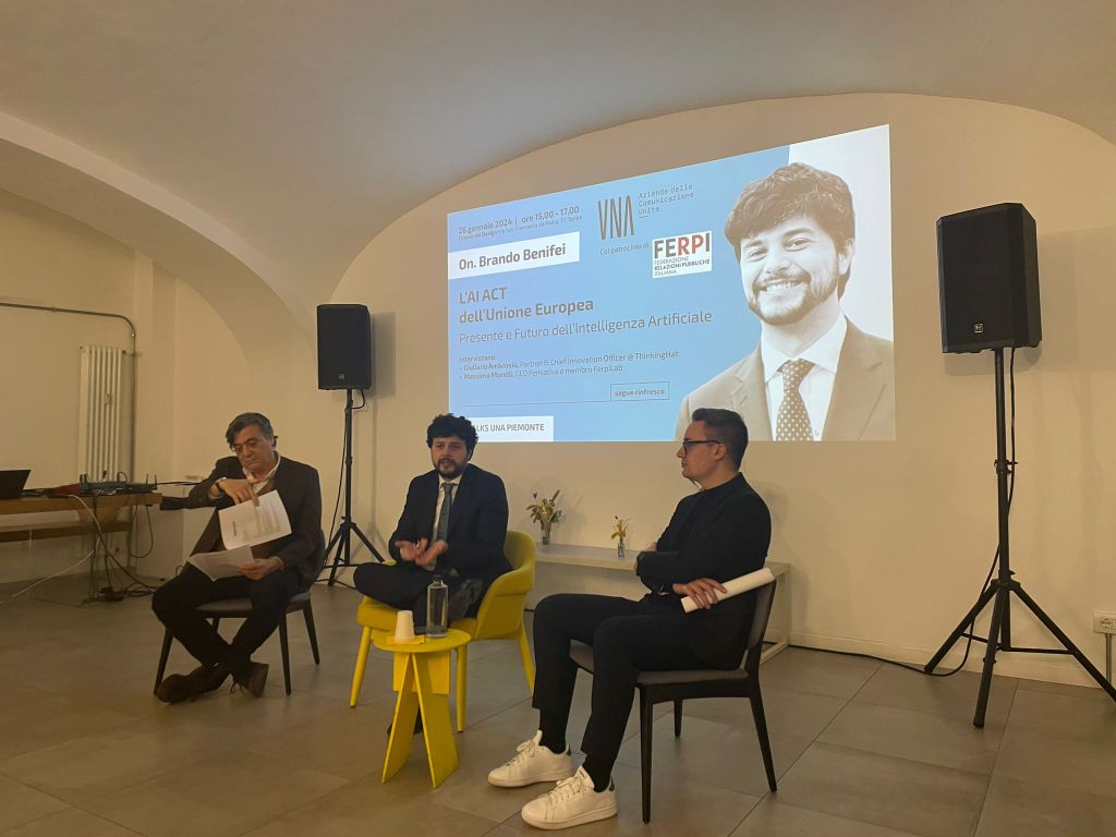 L’incontro, organizzato presso il Circolo del Design a Torino, aveva come tema centrale il Presente e il Futuro dell’intelligenza artificiale (IA) e l’importanza della sua regolamentazione comunitaria, nota come AI Act, che è stata approvata dal Parlamento europeo a giugno 2023 e che dovrebbe entrare in vigore nel 2024.