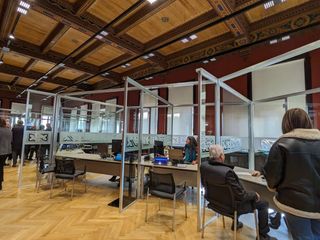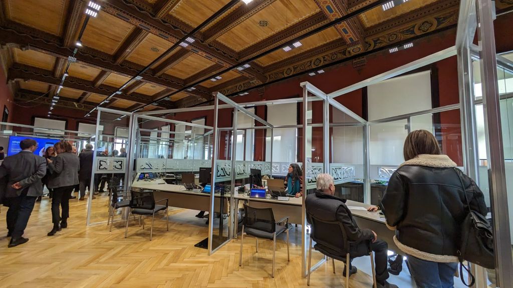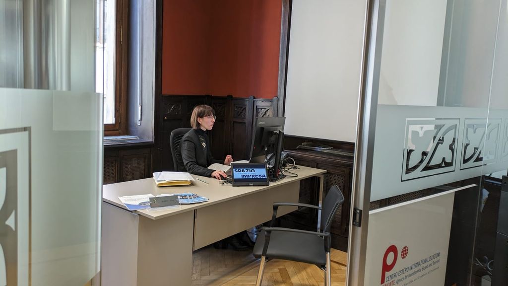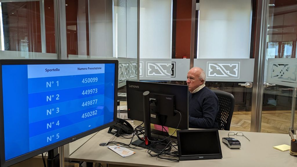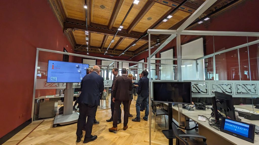 Il locale è stato ristrutturato e reso attuale, con tante scrivanie separate da pareti trasparenti dove l'imprenditore fruisce di assistenza personalizzata.