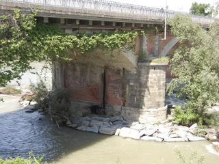 Il ponte in muratura è lungo 190 metri ed è composto in totale da sette campate, ciascuna con una luce di 27 metri. L’impalcato, condiviso dalla sede stradale e dalla sede ferroviaria, è largo complessivamente 15,9 metri.