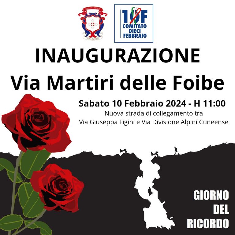 In occasione del Giorno del Ricordo, il comune di Valdieri intitola una via ai Martiri delle Foibe. Si tratta della nuova strada di collegamento tra via Giuseppa Figini e via Divisione Alpina Cuneense.
