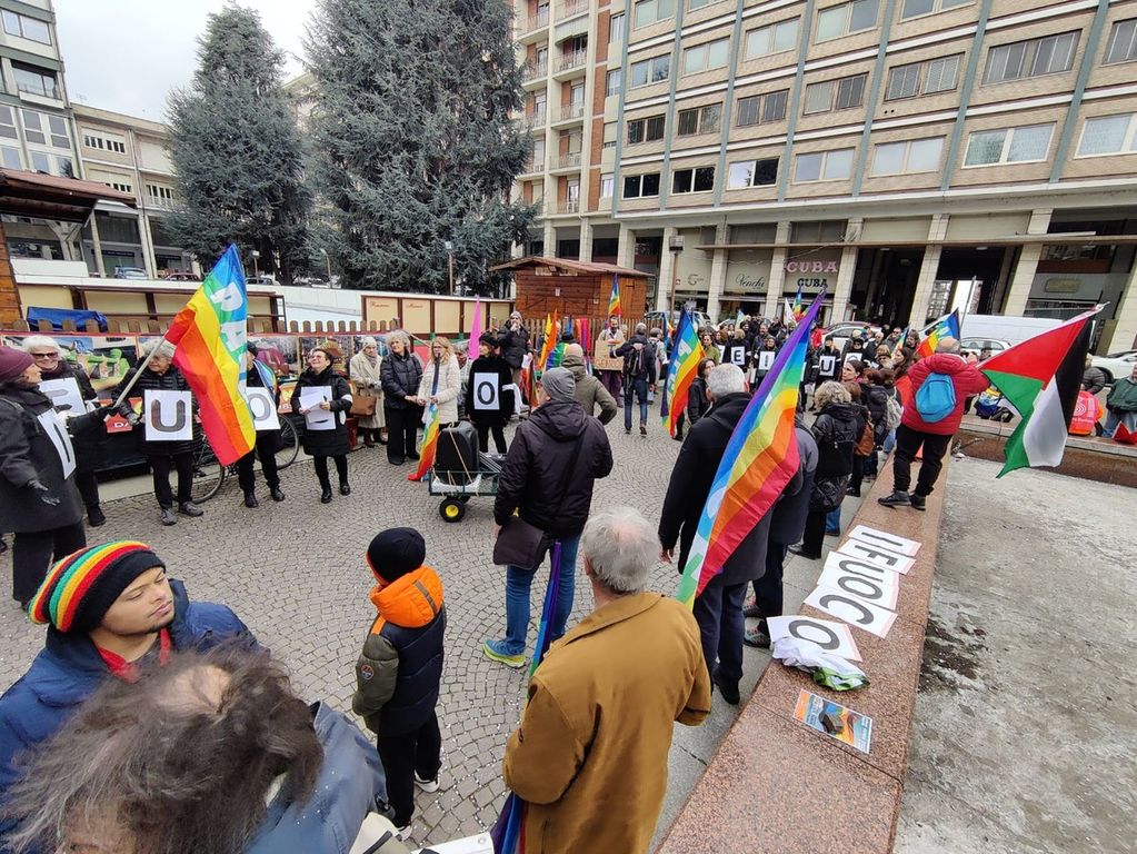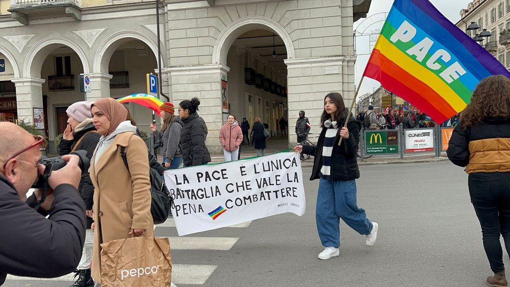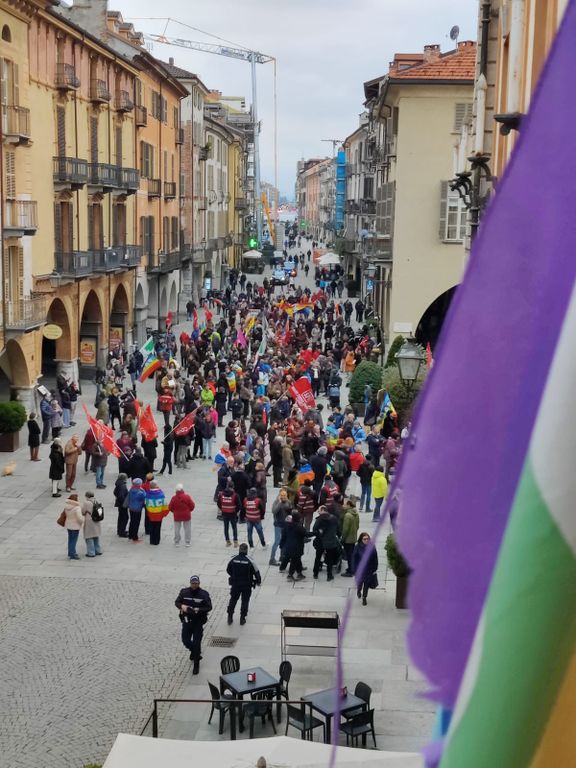 Tanti colori, tante bandiere della pace, tante nazioni abbracciate, centinaia di persone a Cuneo per manifestare unite contro ogni guerra in piazza Europa. Hanno aperto il corteo le "donne per la pace" vestite a lutto e che portano la scritta collettiva "cessate il fuoco".