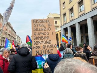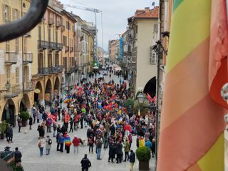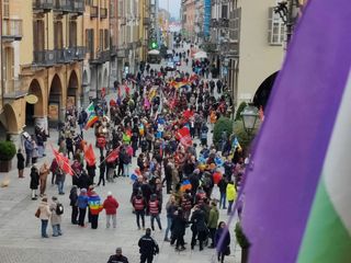 Dopo le parole è partito il corteo a ritmo di musica e di speranza. Una lunga successione di bandiere e colori, con più di 500 manifestanti (numero confermato dalla questura) si è mossa al grido di "Cessate il fuoco". Si chiede la fine di tutte le guerre, tra gli slogan: "Palestina libera". Il serpentone ha percorso corso Nizza raggiungendo piazza Galimberti intorno alle 16,40, per proseguire lungo via Roma alla volta del Palazzo Municipale.