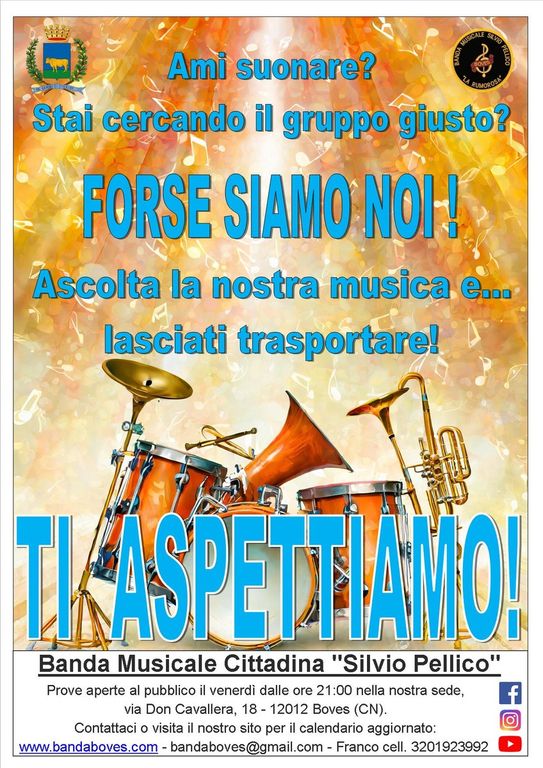 Le prove sono aperte a tutti e si svolgono il venerdì sera alle ore 21 in via Don Cavallera 18 a Boves. Per dettagli e informazioni www.bandaboves.com oppure Franco (tel. 320 192 3992)