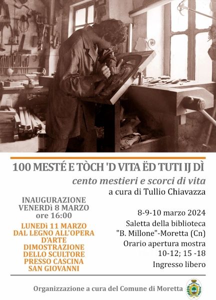 Il Comune di Moretta promuove l'8, il 9 e il 10 marzo presso la biblioteca "B.Millone" la mostra "100 mestieri e scorci di vita" dello scultore morettese Tullio Chiavazza. Una mostra inedita ma che intende valorizzare le eccellenze presenti sul territorio morettese, perché come sostiene il primo cittadino Giovanni Gatti, costituisce il valore aggiunto, l'elemento identificativo di una comunità in cui poter far emergere e apprezzare le potenzialità presenti. Inoltre Tullio Chiavazza fa un mestiere che si è tramandato di padre in figlio per sei generazioni, dove la passione, la cura del dettaglio, il lavoro minuzioso che richiede tempo, l'originalità e la volontà di creare un pezzo unico hanno, negli anni, portato ad una artigianalità d'eccellenza apprezzata con importanti riconoscimenti. La mostra sarà costituita di bassorilievi lignei che rappresentano i mestieri di ieri e di oggi.