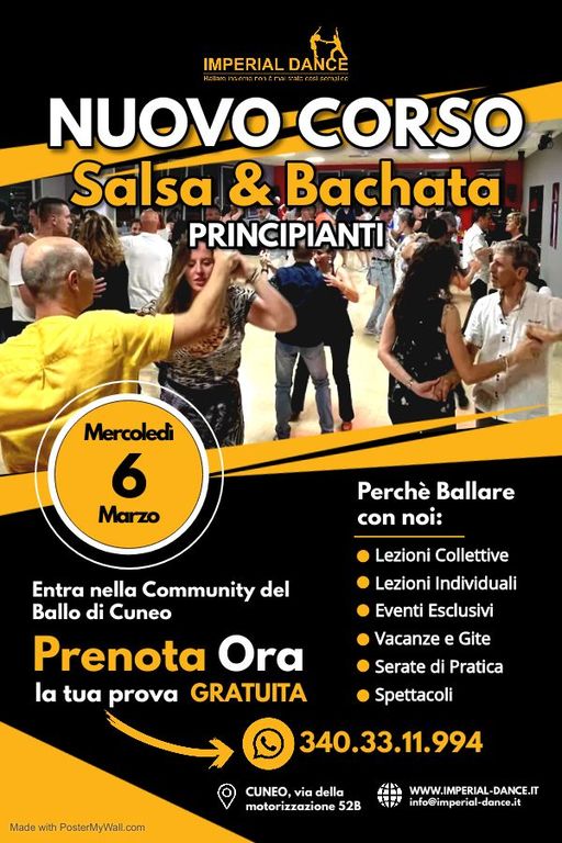 L'attesa è quasi finita per gli appassionati di Salsa e Bachata di Cuneo, poiché mercoledì 6 marzo alle ore 21:00 presso la Imperial Dance Academy inizierà il nuovo corso di salsa e bachata per principianti. Un'emozionante occasione per immergersi nel coinvolgente mondo della danza latino-americana.