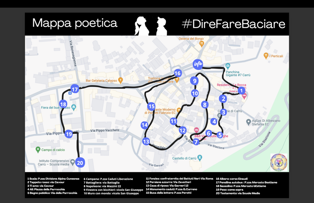 Si chiama "Dire, fare baciare" l'insolito itinerario in venti tappe per amare la poesie a conoscere i monumenti e i luoghi simbolo di Carrù.