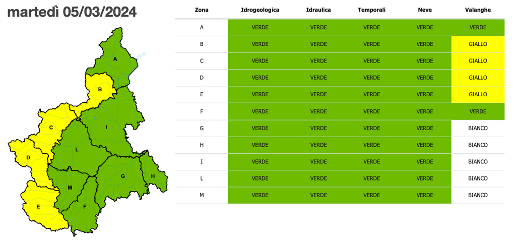 Rientra almeno in parte l’allerta meteo sulla nostra provincia. Se per oggi, lunedì 4 marzo, il Cuneese era ancora toccato dall’allerta arancione sulla Valle Po e da quella gialla per la zona E, che ricomprende valli Varaita, Maira e Stura, per la giornata di domani, martedì 5, il bollettino appena diffuso dall’Agenzia Regionale per l’Ambiente raccomanda ancora prudenza in queste stesse zone, ma con livello di attenzione giallo.