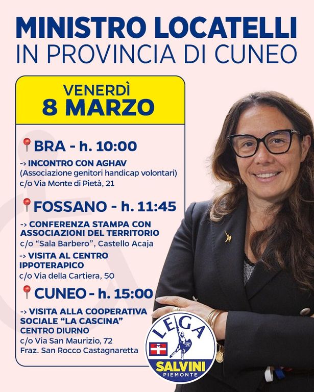 Venerdì 8 marzo la Lega Salvini Premier della provincia di Cuneo organizzerà un tour per la Granda del ministro per le Disabilità Alessandra Locatelli.