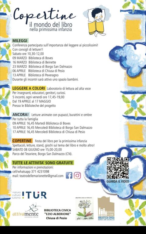 Un progetto che coinvolge le biblioteche dei comuni di Boves, Borgo San Dalmazzo, Chiusa di Pesio, Beinette e Peveragno, vincitore del bando Leggimi del Cepell, Centro ministeriale del libro e della lettura, presentato in partenariato con tutti e cinque i comuni e con la cooperativa sociale Fiordaliso. Le attività di "Copertine" saranno tutte gratuite e si rivolgeranno al pubblico delle famiglie, ma anche degli insegnanti, degli educatori e di chiunque si interfacci col mondo dell'infanzia e della letteratura ad essa dedicata.