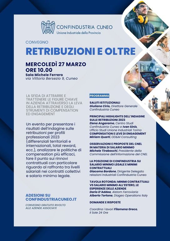 Il quadro sopra delineato contribuisce a evidenziare la rilevanza del convegno “Retribuzioni e oltre” rivolto ai responsabili delle risorse umane e che si terrà mercoledì 27 marzo alle 10 presso la sede di Confindustria Cuneo. Nel corso dell’incontro verranno presentati i risultati dell’indagine sulle retribuzioni per profili professionali (differenziali territoriali e internazionali, total reward, ecc.) e si fornirà un’analisi delle politiche di “compensation” più efficaci, ma sarà anche l’occasione per fare il punto sui rinnovi contrattuali con particolare riguardo al raffronto tra livelli salariali nei contratti collettivi e salario minimo legale.