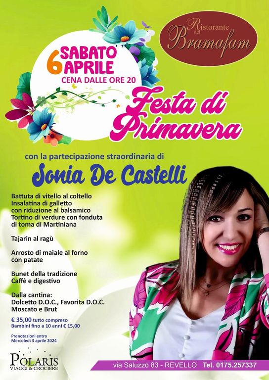 Si inizia dalle ore 20 di sabato 6 aprile a festeggiare la Primavera al Ristorante del Bramafam di Revello. La partecipazione straordinaria di Sonia De Castelli contribuirà a rendere la serata indimenticabile, complice la sempre ottima accoglienza di Barbara e Daniele che, insieme al loro staff, sapranno mettere a loro agio grandi e piccini.
