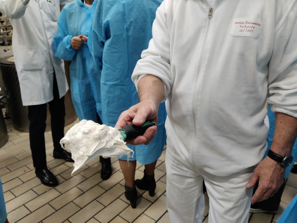 Giuliana Cirio, come il presidente di Confindustria Cuneo, Mariano Costamagna hanno anche messo le “mani in pasta” durante l’interessante visita nei laboratori Sebaste, lavorando il torrone caldo, pronto alle successive fasi di lavorazione, dopo oltre 6 ore di cottura a bagnomaria e una miscelazione di miele, zucchero, albume d’uovo e glucosio cominciata la sera precedente.