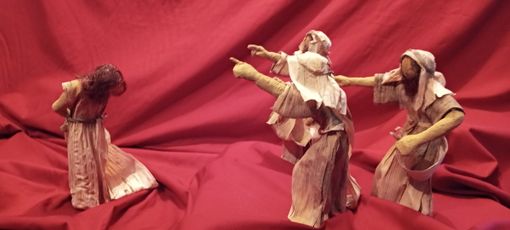 Esposta nella Confraternita della Rossa fino al 9 aprile, sarà allestita lungo un percorso artistico che si dipanerà su 15 stazioni, compresa la resurrezione, con 46 figure alte una ventina di centimetri, realizzate con polipan (un materiale edilizio), colorate con terra refrattaria e vestite con foglie di mais. L’effetto è sorprendente per intensità, per la capacità con cui queste statuine spoglie (l’allestimento è limitato a faretti per l’illuminazione e a drappi colorati) riescono a rendere la drammaticità di ogni situazione. “È un lavoro che risale al 2008 - racconta - e che ho esposto una sola volta, quell’anno, a Maddalene. Da allora è stato inscatolato per 16 anni: l’ho tirato fuori per questa occasione”.