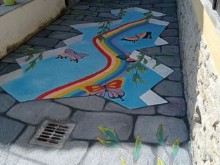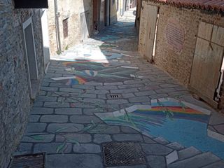 Mango, domenica 7 aprile h.16,00 - Un'opera d'arte di grandi dimensioni realizzata dall'artista Tore Milano impreziosisce da alcuni giorni vicolo Lamarmora nel centro storico di Mango, in provincia di Cuneo. L'opera, intitolata "Luci in profondità", è stata voluta dall'Amministrazione Comunale per sopperire all'impossibilità di installare i blocchetti necessari per il completamento dell'importante intervento di ristrutturazione delle strade del centro storico.