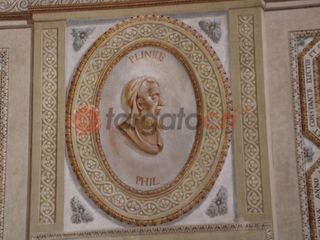 La prima scritta, in latino, racconta che: Giuseppe Antonio Corte, XXX vescovo nell’anno 1793 restituì ai posteri in più elegante struttura questa aula dell’episcopio un tempo sede dell’accademia subalpina abbellita con opere di pittura dai predecessori Giovanni Castrucci, Carlo Ripa, Giovanni Isnardi, con personaggi di Mondovì, illustri per pietà, cultura e dignità. Per l’ingiuria del tempo l’aula, in degrado ormai e in rovina, fu decorata di nuove opere di pittura e le fondamenta attrezzate per ambienti nuovi.
