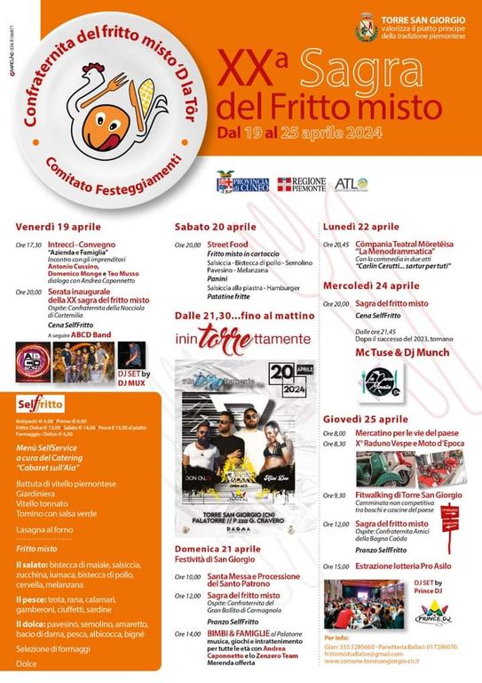 Dal 19 al 25 aprile, infatti, torna in scena il Fritto Misto, con un calendario di appuntamenti per tutti i gusti e tutte le età a ingresso rigorosamente gratuito. In plancia di comando il Comune, guidato dal sindaco Daniele Arnolfo; il coordinamento organizzativo è affidato alla Confraternita del Fritto Misto, capeggiata da Mario Monge. Tutt'attorno un affiatato gruppo di volontari che, come da tradizione, si ferma per una settimana con l'obiettivo di dedicarsi anima e corpo al paese e al fritto nei giorni di San Giorgio.