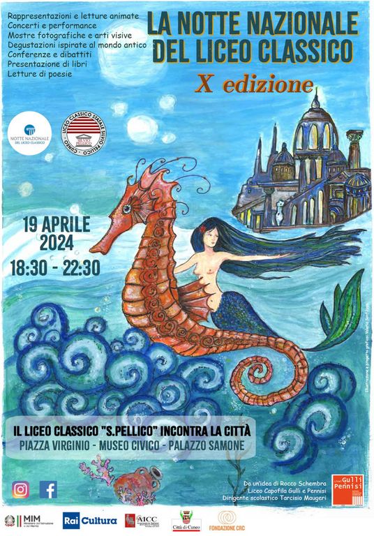 Venerdì 19 aprile dalle 18.30 alle 22.30, a Cuneo in occasione della X edizione de “La notte nazionale del liceo classico”, appuntamento che si svolge in contemporanea nei licei classici di tutta Italia e che ha come finalità la promozione della cultura classica (greca e latina) nonché la valorizzazione del curricolo del Liceo Classico in tutta la sua complessità e versatilità, si svolgerà l’evento “Il liceo classico S.Pellico incontra la città”, organizzato dal liceo classico statale Silvio Pellico. Luoghi della manifestazione saranno piazza Virginio, il Museo Civico (via S.Maria, 10), Palazzo Samone (via A.Rossi, 4) e Palazzo Santa Croce (via S.Croce, 6). Oltre che agli studenti dei licei classici, l’iniziativa è aperta alle famiglie, ma anche ai ragazzi che si apprestano a frequentare la scuola secondaria superiore, ora frequentanti la terza media. L’appuntamento cuneese si svolge con la collaborazione e il patrocinio della Città di Cuneo e di Fondazione Crc. Tutti gli eventi sono gratuiti e aperti al pubblico. Per maggiori informazioni: info@liceocuneo.it