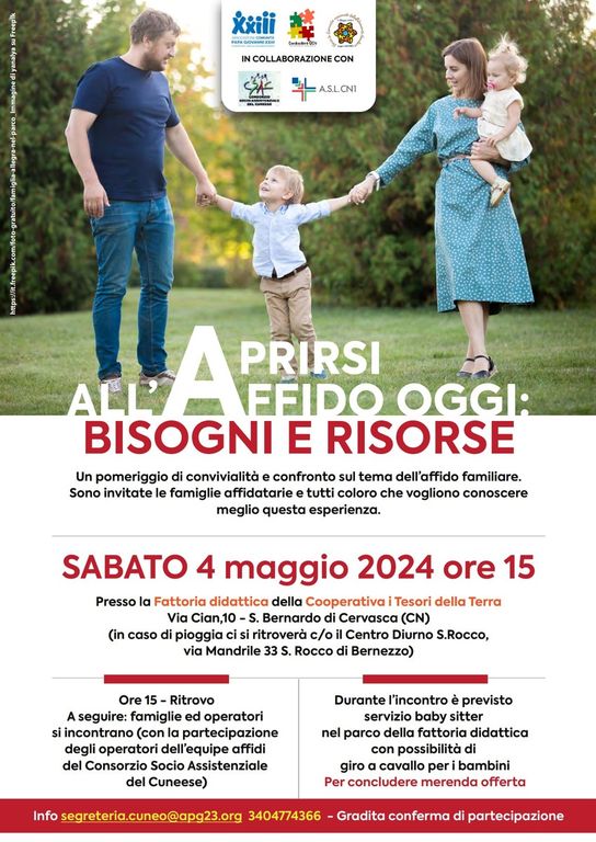 Saranno presenti gli operatori dell'equipe affidi del Consorzio Socio Assistenziale del Cuneese per un momento di confronto dedicato agli adulti, nel frattempo per i bambini è previsto intrattenimento con possibilità di giro a cavallo. In conclusione: la merenda tutti insieme.