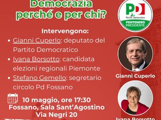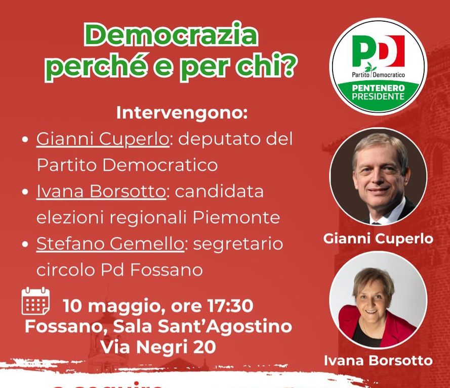 Saranno presenti all’incontro i parlamentari del Partito Democratico Gianni Cuperlo e Andrea Giorgis, e Ivana Borsotto, componente della Segreteria del PD fossanese e candidata alle prossime Elezioni Regionali per la Provincia di Cuneo nella lista a sostegno di Gianna Pentenero.