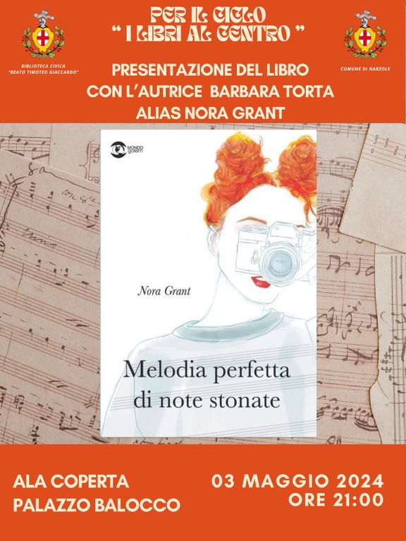 Venerdì 3 maggio alle ore 21, sotto l'ala di palazzo Balocco (in casa Balocco, davanti alla chiesa in caso di mal tempo), incontreremo Nora Grant, alias Barbara Torta per parlare del suo libro: "Melodia perfetta di note stonate".