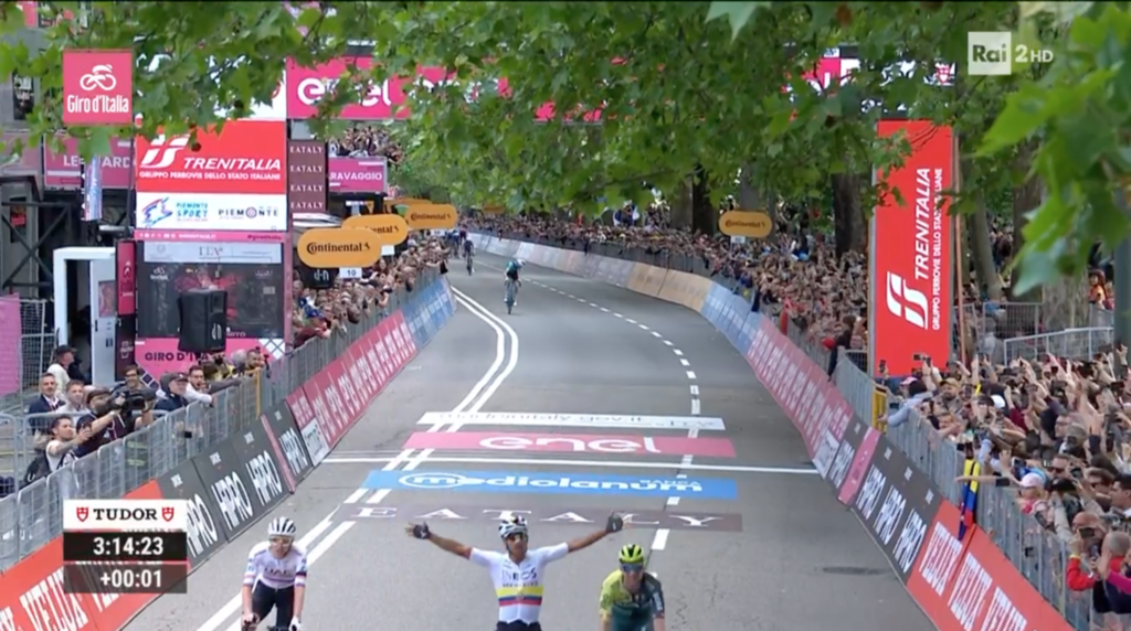 Così come aveva previsto Vincenzo Nibali nei giorni scorsi, come ha detto Balmamion al nostro giornale. il fenomeno sloveno ha voluto mettere da subito le cose in chiaro su come andrà questa 107^ edizione del Giro. Sul traguardo di Corso Moncalieri si impone l’ecuadoreno Jhonatan Narvarez, della Ineos-Grenadiers, prima maglia rosa di questo Giro che si apre tutto in Piemonte, davanti a Maximilian Schachmann (Bora-Hansgrohe) e Tadej Pogacar (Uae Team Emirates).