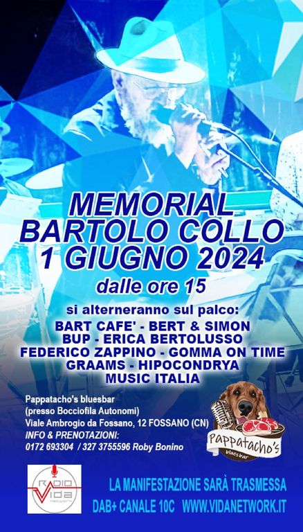 A Fossano, al Pappatacho's Blues Bar (ASD Autonomi, via Ambrogio da Fossano 12), sabato 1° giugno dalle ore 15.30 fino a tarda serata si tiene il “Memorial Bartolo Collo”, una kermesse di musica per ricordare l’amico Bartolo Collo, filosofo e cantante che ha commosso profondamente coloro che hanno avuto il privilegio di ascoltarlo e suonare con lui.