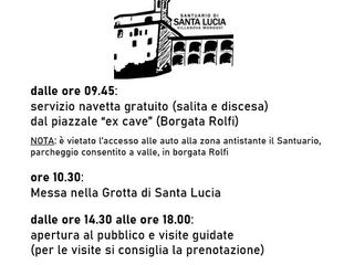 L’Associazione di Volontariato Amici di Santa Lucia ODV (nata nel 2023), che si prodiga alacremente per il recupero e cura del Santuario, dopo alcuni lavori necessari di sistemazione occorsi al tetto, ripropone anche per la corrente stagione estiva le visite guidate e le aperture domenicali, al fine di scoprire la bellezza, la storia, la cultura e la fede che arricchiscono il caratteristico Santuario nella roccia della Valle Ellero.