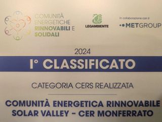 La CER MONFERRATO è risulta vincitrice del primo premio per le CERS realizzate ed unica premiata per il Nord Italia tra tutte le Comunità Energetiche partecipanti al concorso.