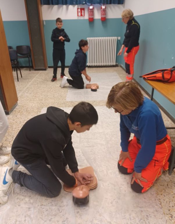 Nel progetto dell’“Open Day del soccorso” i ragazzi di scuola secondaria, nei giorni del 18,19,22 e 23 aprile, hanno seguito le lezioni dei Volontari del Soccorso sull’ uso del Numero Unico di Emergenza, ovvero 112, sul significato della Catena della Sopravvivenza formata da quattro anelli: la chiamata di soccorso, il massaggio cardiaco, l’uso del defibrillatore e il trasporto in ospedale e sperimentando praticamente il massaggio cardiaco.