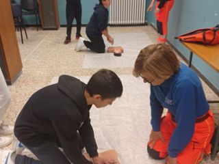 Nel progetto dell’“Open Day del soccorso” i ragazzi di scuola secondaria, nei giorni del 18,19,22 e 23 aprile, hanno seguito le lezioni dei Volontari del Soccorso sull’ uso del Numero Unico di Emergenza, ovvero 112, sul significato della Catena della Sopravvivenza formata da quattro anelli: la chiamata di soccorso, il massaggio cardiaco, l’uso del defibrillatore e il trasporto in ospedale e sperimentando praticamente il massaggio cardiaco.