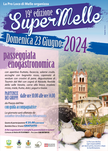 Super Melle è una manifestazione organizzata dall’Associazione Turistica Pro Loco Melle, in collaborazione con il Comune di Melle e l’amministrazione comunale, il Consorzio del Toumin dal Mel, Campagna amica Coldiretti, il gruppo alpini di Melle, la Croce Rossa Italiana – delegazione di Melle, l’associazione Tavio Cosio e il comprensorio alpino della Valle Varaita.