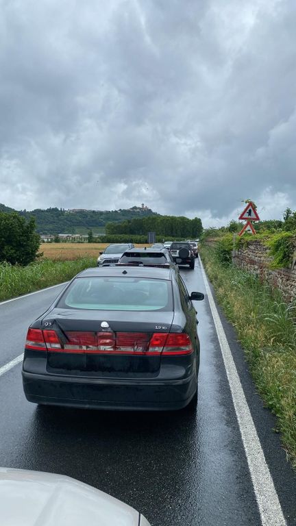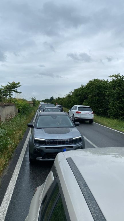Traffico bloccato a Pollenzo a causa di un incidente stradale, in cui un veicolo è in corso di romozione da parte del carro attrezzi.