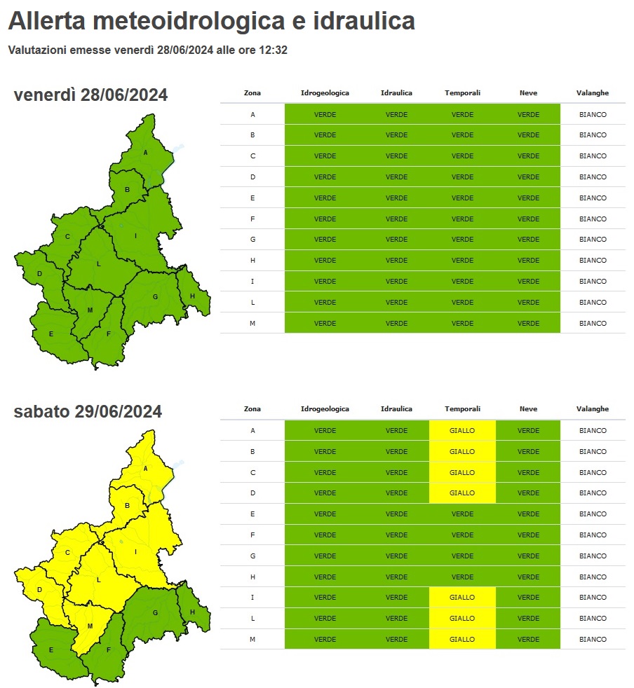 Probabile interessamento anche di Langhe e Monferrato mentre i fenomeni meno intensi sono attesi su Alpi Marittime e Liguri e sui settori più meridionali delle province di Asti e Alessandria. I temporali saranno accompagnati anche da forti raffiche di vento discendente, fulminazioni e potranno verificarsi locali allagamenti ed isolati fenomeni di versante. In conseguenza di tali previsioni il Centro Funzionale di Arpa Piemonte ha emesso allerta gialla per rischio idrogeologico per temporali sulle zone di pianura e sul settore nordoccidentale.