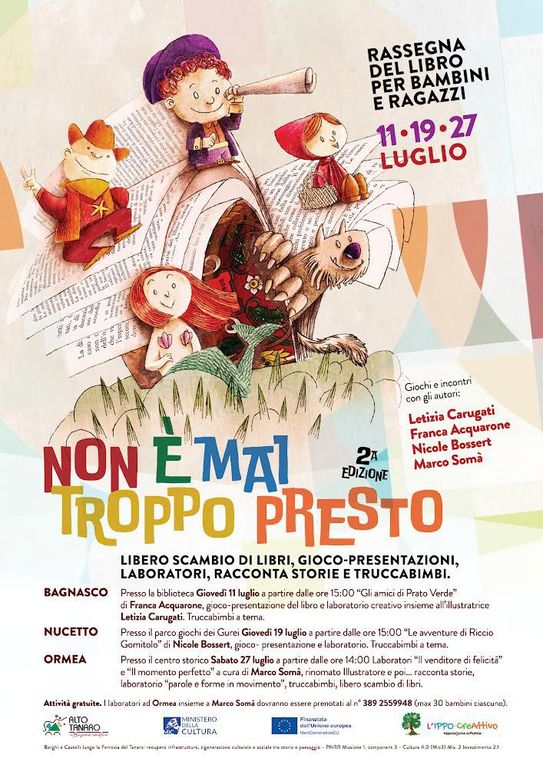Al via la seconda edizione di “Non è mai troppo presto”, la rassegna del libro per bambini e ragazzi in Alto Tanaro, che anche quest’anno ospiterà a Bagnasco, Nucetto e Ormea laboratori, racconta storie, presentazioni di libri e non solo.