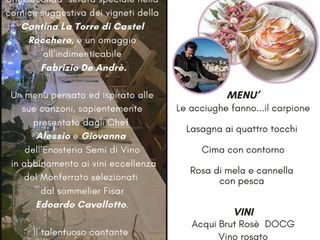 Le sorprese non finiranno qui: nella seconda serata verrà reso omaggio a Fabrizio de André con il cantante Christian Gullone che eseguirà alcune indimenticabili canzoni del cantautore genovese, mentre il giornalista Claudio Porchia parlerà dei riferimenti floreali presenti nelle sue composizioni. Il menù preparato dagli chef Alessio e Giovanna proporrà un viaggio attraverso i sapori e le emozioni delle sue canzoni. Si inizierà con le Acciughe fritte servite su giardiniera della casa, ispirate alla canzone le “Acciughe fanno pallone”, per poi continuare con le Lasagnette al Ragù bianco e la Cima alla Genovese. Per concludere, le Rose di Sfoglia e Pesca con marmellata di rose. Il sommelier Edoardo Cavallotto ha selezionato i seguenti vini per essere serviti in abbinamento: Acqui Brut Rosè Docg, Barbera del Monferrato frizzante Dpc e Brachetto d’Acqui Docg.