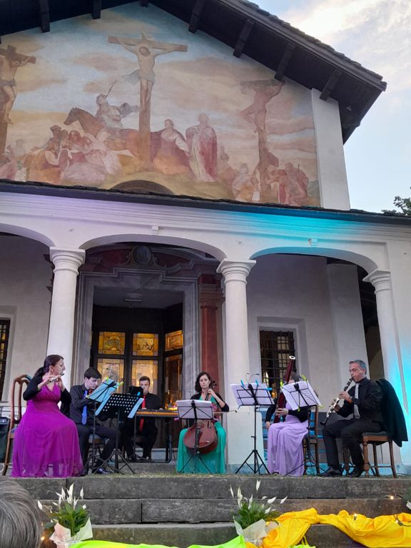 Il concerto "Shall we dance?" è stato aperto con maestria dal sestetto Harmoniae Colores, composto da Sara Bondi al flauto, Andrea Sarotto al clarinetto, Paola Sales al fagotto, Giorgio Damiano al violino, Maria Becchis al violoncello e Giovanni Damiano al pianoforte. Gli spettatori hanno potuto godere di straordinarie esecuzioni di brani di Susato, Bizet, Saint-Saëns, Bernstein e Lloyd Webber, regalando un'esperienza musicale unica con una vista mozzafiato sul suggestivo panorama di Borgo San Dalmazzo.