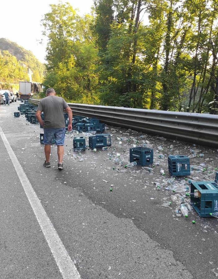 Bagnasco, camion pieno di bottiglie d’acqua perde il carico sulla Statale 28