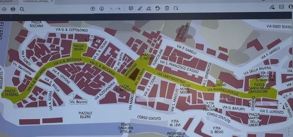 L'intervento di riqualificazione ha interessato l'antico rione comprendente via Beccaria, via Alessandria, piazza San Pietro, vicolo Martinetto, via Meridiana, piazza Cesare Battisti e piazza San Pietro da dove il percorso si ricongiunge alla già rinnovata via Sant’Agostino e ha anche incluso la sostituzione dell'acquedotto esistente nel tratto tra piazza Carlo Ferrero e via Biglia e sulla piazza stessa per risolvere problematiche ricorrenti che si verificavano in caso di precipitazioni abbondanti.