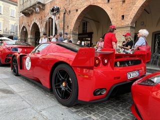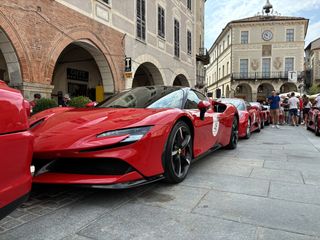 Partiranno nel primo pomeriggio per la "Salita in alta quota" verso Prato Nevoso le super car che, questa mattina, hanno dato vita alla scritta Ferrari su piazza Maggiore.