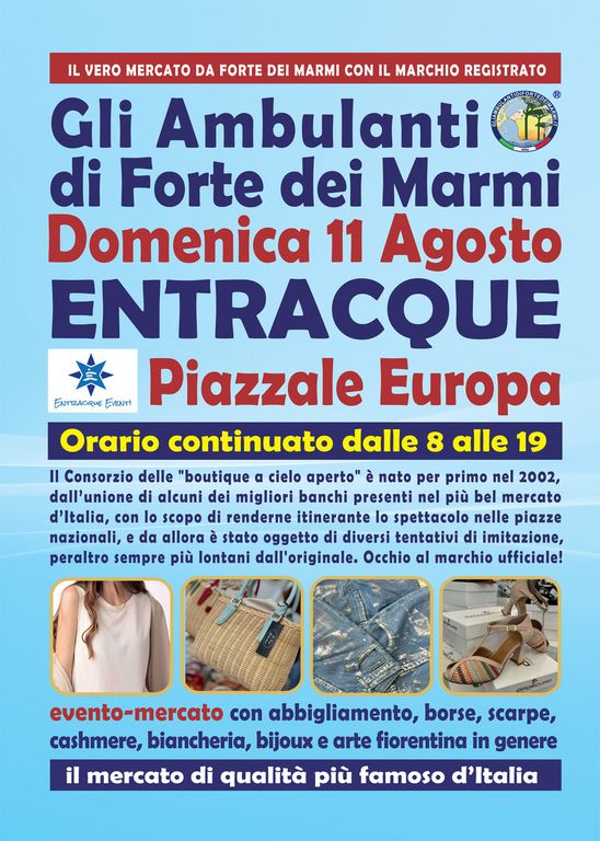 Gli Ambulanti di Forte dei Marmi: le bancarelle del mercato di qualità più famoso d’Italia tornano come ogni estate a gran richiesta nelle località turistiche piemontesi con tutto il meglio del Made in Italy artigianale e le ultime tendenze della moda. Si potranno infatti ammirare le ormai mitiche “boutique a cielo aperto” dell’originale Consorzio domenica 11 agosto ad ENTRACQUE (Cuneo), nel tratto tra Piazzale Europa e Viale Kennedy. Dunque, un appuntamento da non perdere e attesissimo dai tanti appassionati del genere, che sarà come sempre all’insegna dello shopping più glamour e conveniente, con orario continuato, anche in caso di maltempo, dalle 8 alle 19.