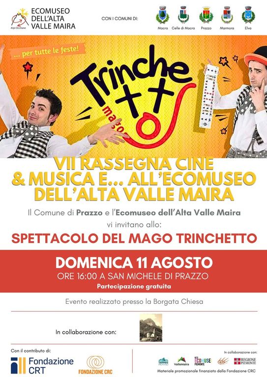 Appuntamento con lo Spettacolo di MAGIA e GIOCOLERIA della VII RASSEGNA CINE&MUSICA E..... ALL'ECOMUSEO DELL'ALTA VALLE MAIRA che quest’anno propone 15 eventi musicali e di intrattenimenti in cartellone e 2 fuori cartellone programmati durante i mesi estivi nei comuni dell’Ecomuseo.