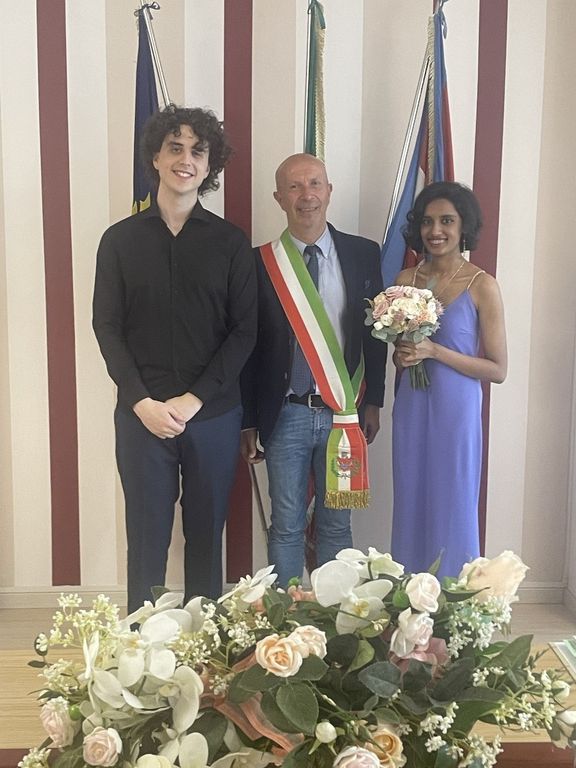 Martedì 30 luglio nella sala consiliare del Comune di Venasca il Sindaco Silvano Dovetta ha celebrato con rito civile il matrimonio di Angelo Portaluri e di Muralidharan Vanitha Rajeshwari, detta Kika. Angelo, che abita a Venasca insieme ai suoi genitori Giuseppe e Sandra e al fratello Emanuele dall’anno 2010, ha sposato Kika, arrivata da poco dall’India nella comunità venaschese, dove ha trovato nuovi affetti e una nuova famiglia. Dal momento che la sposa non conosce la lingua italiana, la professoressa Maria Pia Caterina Chiapella di Frassino è stata incaricata in qualità di interprete durante la celebrazione del matrimonio.