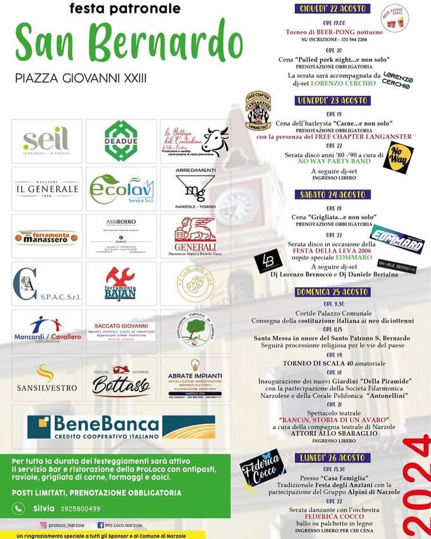 I ragazzi della leva del 2006 saranno invece i protagonisti assoluti del sabato sera con la loro festa dei 18 anni condivisa con l'intera comunità. Dalle 19 cena "Carne ... e non solo" e dalle 22 musica disco con ospite speciale "Edmmaro" e a seguire dj-set con "Lorenzo Bernocco e Daniele Bertaina".