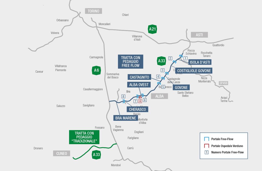 - portali da 1 a 4 nel tratto località Rocca Schiavino–Castagnito attualmente già a pagamento, dove si pagherà solo in base al tratto percorso