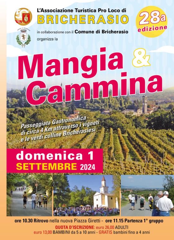 Si sono aperte lunedì le iscrizioni alla Mangia & Cammina, la tradizionale camminata enogastronomica tra i vigneti e le verdi colline di Bricherasio (To) giunta alla ventottesima edizione. L’evento, organizzato dalla Pro loco in collaborazione con i commercianti e le aziende locali si terrà domenica 1° settembre. “Questa è l’ultima occasione per provare il classico percorso di circa quattro chilometri nel centro del paese: dall’edizione del prossimo anno il tragitto verrà completamente stravolto, così come facciamo ogni cinque o sei anni” annuncia Alberto Godino, presidente della Pro loco. Ma una novità arriva già quest’anno: “Per il primo antipasto si tornerà nel parco di Villa Daneo, come si faceva già in passato. I piatti verranno preparati da L’Appetito di Vale & Livi”. Prima, però, ci sarà l’aperitivo curato dalla Pro loco al peso comunale in via Campiglione.