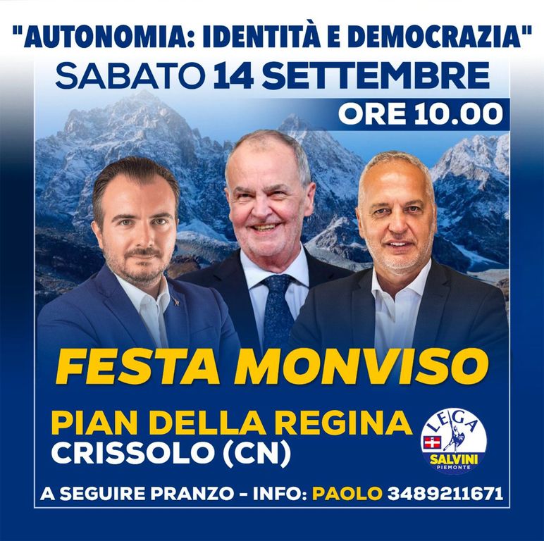 Una festa per ribadire il “sì” convinto della Lega cuneese all’autonomia. Questo il tema della Festa sul Monviso a cui la sezione di Cuneo della Lega invita iscritti e simpatizzanti a partecipare. Una giornata che si terrà come da tradizione a Pian della Regina per incontrarsi e confrontarsi su uno dei capisaldi storici del partito guidato da Matteo Salvini,