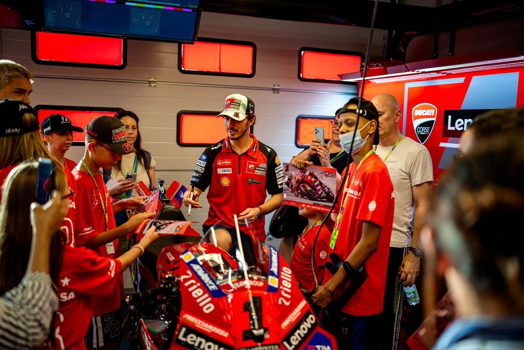 Pecco Bagnaia e la moglie Domizia, con il sostegno del Pecco Fan Club, hanno deciso di portare i pazienti di Casa UGI e dell'ospedale Infantile Regina Margherita di Torino on track al Gran Premio MotoGP di San Marino.